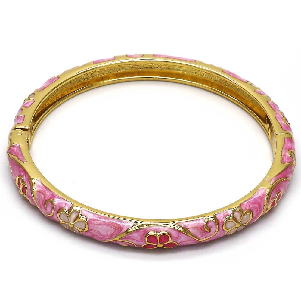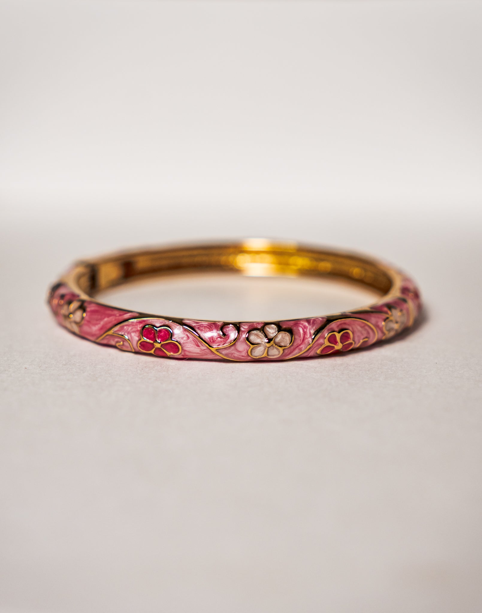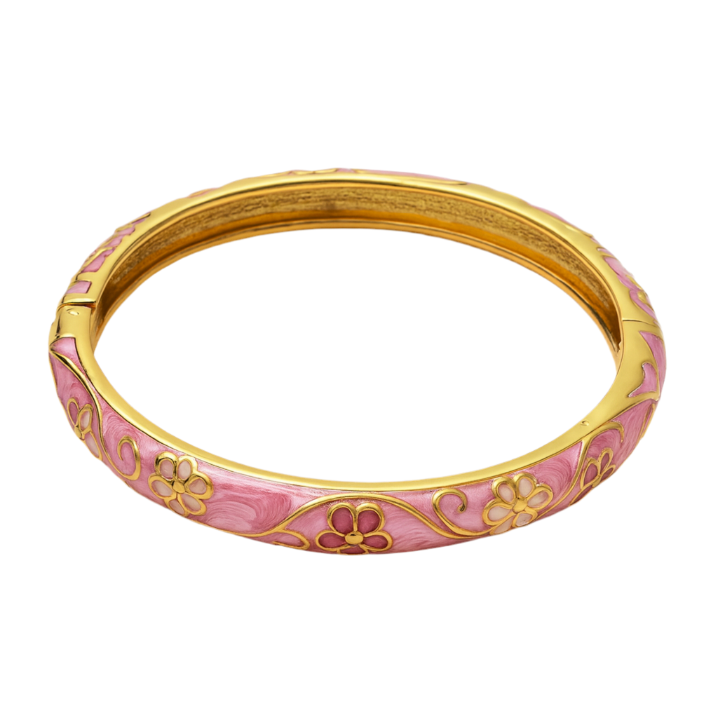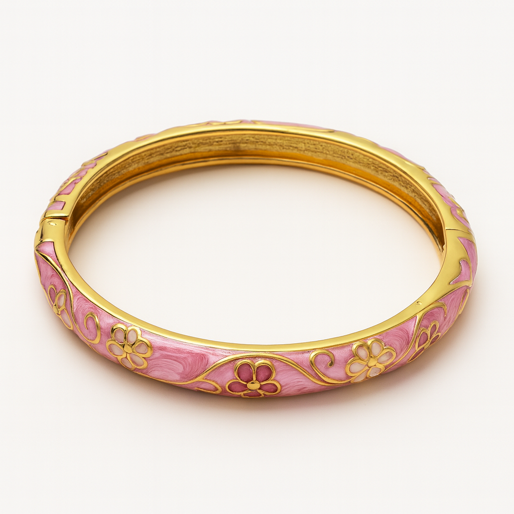 Romantic florals swirl across a blush enamel finish, wrapping your wrist in soft goddess energy.