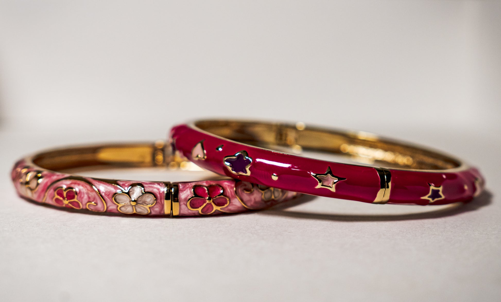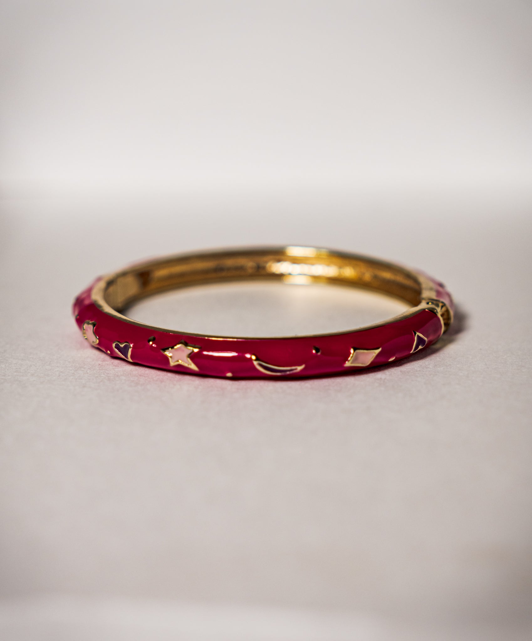 Deep pink enamel with golden stars and hearts. Perfect for stacking or solo glow-ups, it’s instant stardust.
